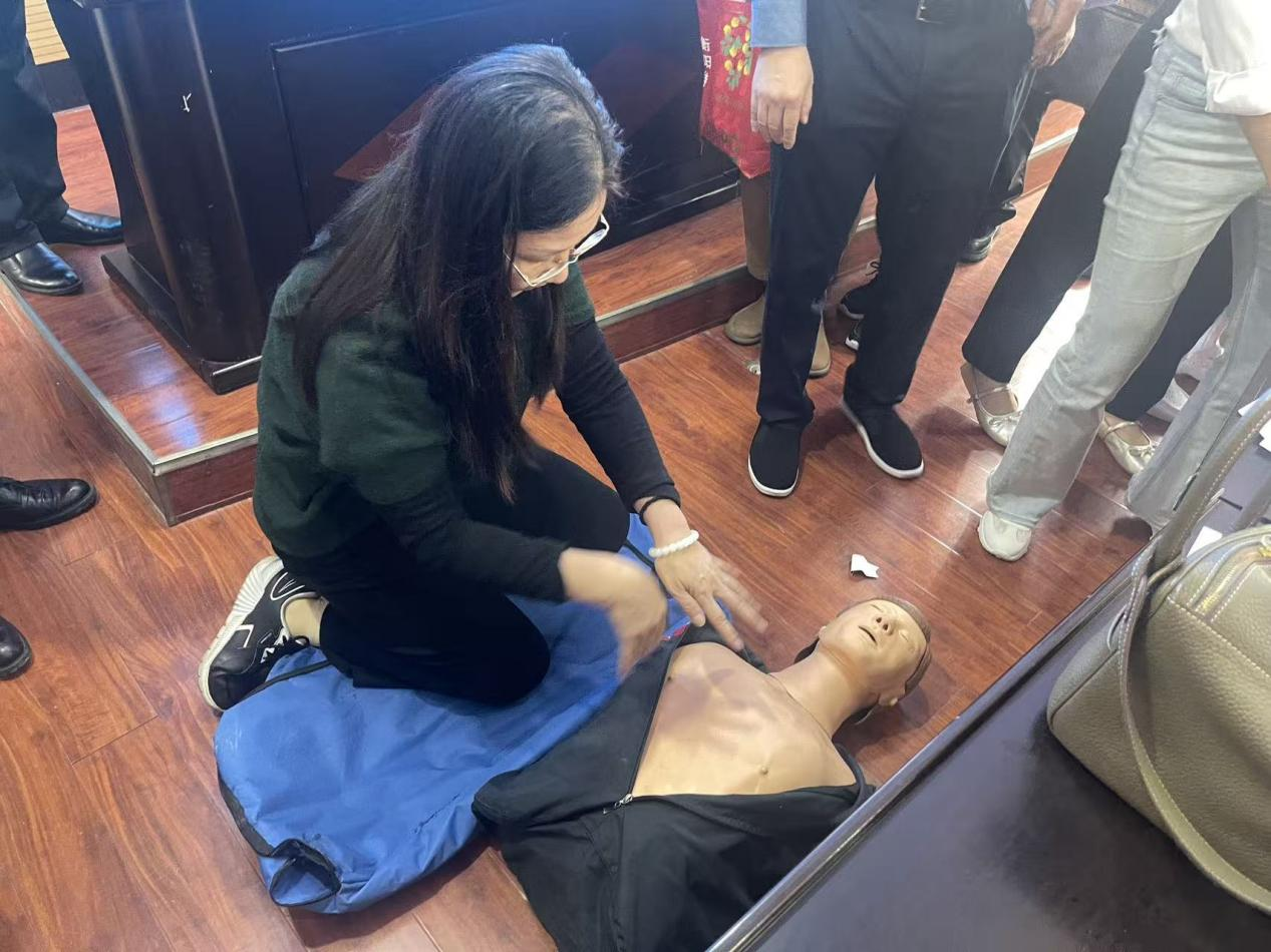 营养科江卫男医师结合丰富的临床经验,细致讲解跌倒、噎食、心脑血管阻塞等突发情况的危险信号与初步判断方法,引导大家建立“早识别、早应对”的急救意识,并演示海姆立克急救法、心肺复苏的操作流程以及自动体外除颤器(AED)的使用方法,通过“理论 + 实操”让现场人员全面掌握相关急救知识和技能。
